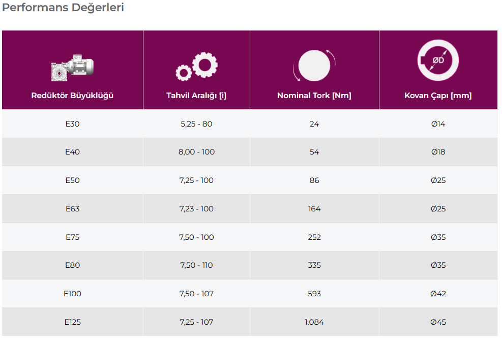 Sementasyon çeliği sonsuz vida ve bronz alaşımı çark dişliden oluşan, giriş ve çıkış milleri birbirlerine dik konumlanmış, gövde üzerindeki ayak delikleri, çıkış flanşı veya tork kolu ile makineye montaj edilen redüktörlerdir