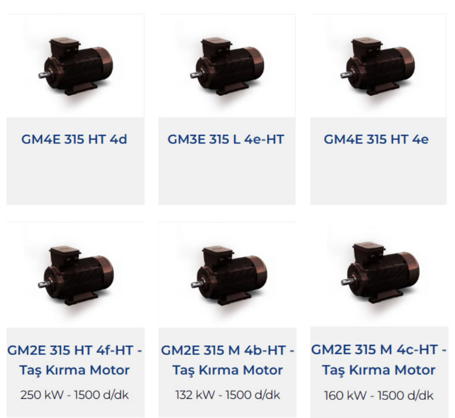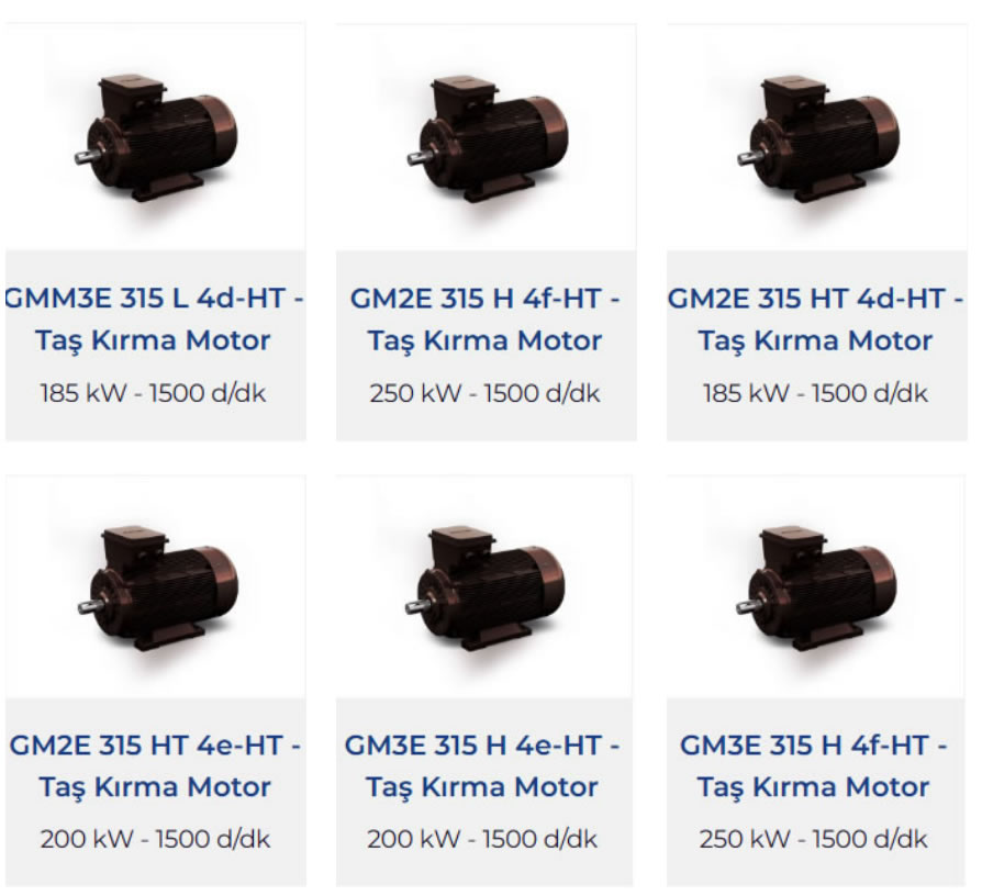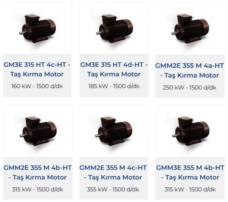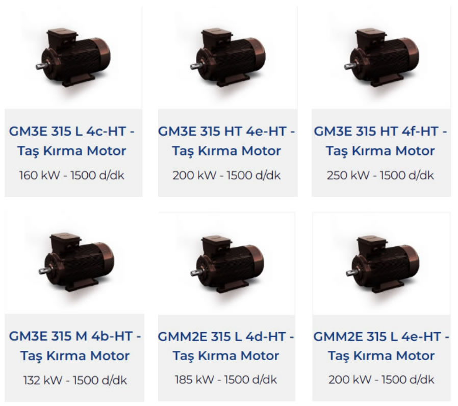 GAMAK Taş Kırma motorları, 315 ve 355 tiplerde 132 kW tan 355 kW a kadar endüstrinin ihtiyaç duyduğu ağır çalışma şartlarına dayanacak şekilde tasarlanmışlardır. Sabit ayaklı pik gövdelerde tasarlanmış olan taş kırma motorları, istek doğrultusunda 315 tiplerde HT kod yapısı ile takma ayaklı olarak da tedarik edilebilmektedir.